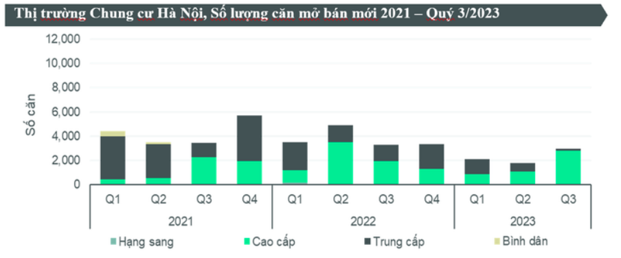 Tính chung 9 tháng đầu năm 2023, tổng cộng có gần 7.916 căn hộ chung cư được ghi nhận đã bán được tại Hà Nội, tập trung ở các dự án phát triển trong khu đô thị lớn ở phía Tây và phía Đông.