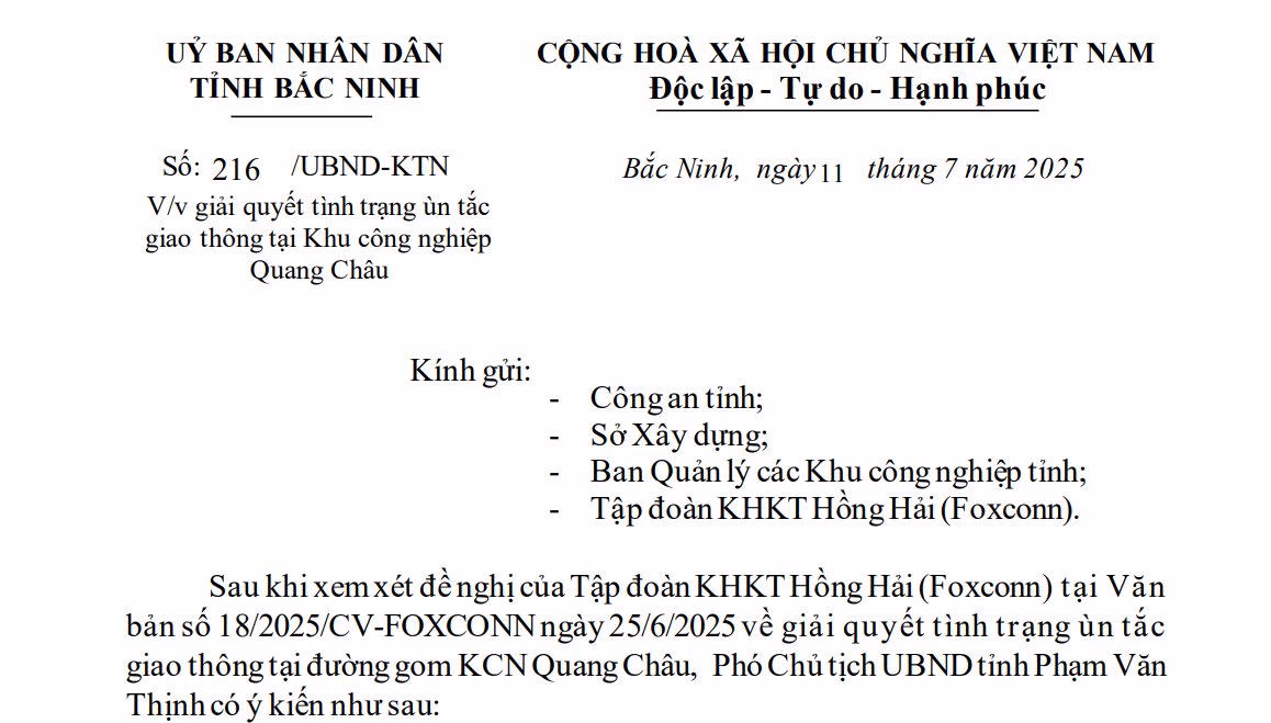 UBND tỉnh Bắc Ninh vừa có ý kiến về đề nghị của Tập đoàn KHKT Hồng Hải (Foxconn) về tình trạng ùn tắc giao thông tại đường gom KCN Quang Châu. KCN này thuộc địa phận tỉnh Bắc Giang (cũ).