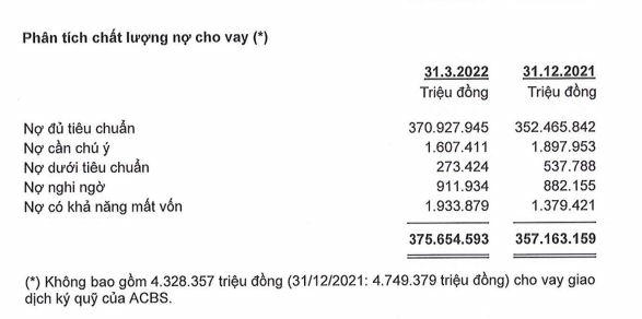 Cụ thể, tổng nợ xấu tính đến 31/03/2022 ghi nhận hơn 3.119 tỷ đồng, tăng 11% so với đầu năm. Trong cơ cấu nợ xấu, nợ có khả năng mất vốn (nợ nhóm 5) tăng tới 40%, lên gần 1.934 tỷ đồng; nợ dưới tiêu chuẩn (nợ nhóm 3) giảm còn 273 tỷ đồng và nợ nghi ngờ (nợ nhóm 4) tăng nhẹ 3%, lên gần 912 tỷ đồng. Như vậy, nợ có khả năng mất vốn tại ACB chiếm tới 61% trong tổng nợ xấu nhóm 3 đến nhóm 5.