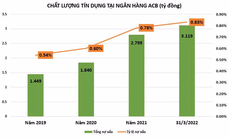 Tính đến cuối năm 2021, nếu không tính hơn 4.749 tỷ đồng cho vay giao dịch ký quỹ của ACBS, tổng nợ xấu của ACB tăng mạnh 52% so với đầu năm, lên mức hơn 2.799 tỷ đồng. Trong đó, nợ dưới tiêu chuẩn tăng mạnh nhất. Kết quả, kéo tỷ lệ nợ xấu trên dư nợ vay của ACB tăng từ mức 0,6% đầu năm lên 0,78 %. Và chỉ trong 3 tháng đầu năm 2022, tổng nợ xấu đã ghi nhận hơn 3.119 tỷ đồng, cao hơn cả nợ xấu của năm 2021.