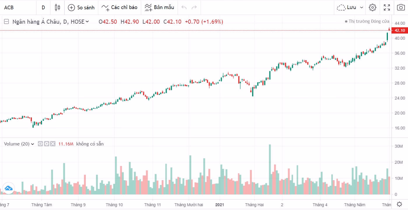 Đóng cửa phiên giao dịch 31/5/2021, giá cổ phiếu ACB đứng ở mức 41.400 đồng/cp, tăng 47% so với đầu năm.