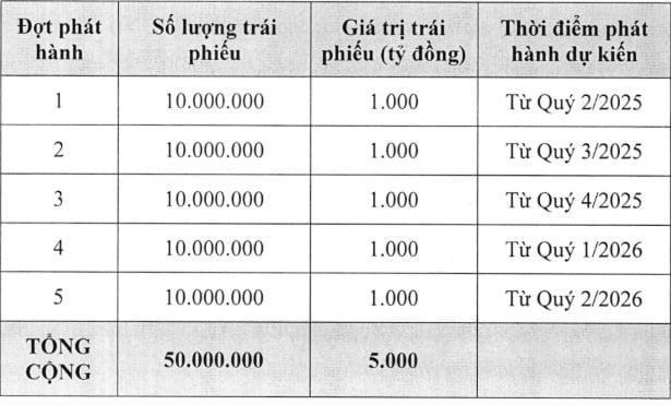Dự kiến, số trái phiếu trên sẽ được phân bổ phát hành trong tối đa 5 đợt, đều đặn theo từng quý từ quý 2/2025 - quý 2/2026 với giá trị mỗi đợt là 1.000 tỷ đồng.