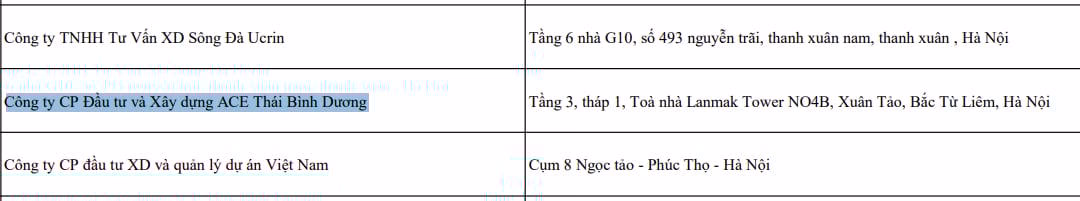 Đáng chú ý, Công ty cổ phần Đầu tư và Xây dựng ACE Thái Bình Dương cũng bị điểm tên trong danh sách này, với 3 tháng chậm đóng bảo hiểm, số tiền gần 1 tỷ đồng. Doanh nghiệp này có địa chỉ tại tầng 3, toà nhà Lanmak Tower NO4B, Xuân Tảo, Bắc Từ Liêm, Hà Nội.