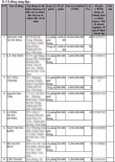 Vốn điều lệ khi thành lập là 80 tỷ đồng. Cổ đông sáng lập gồm 8 cá nhân, trong đó Hoàng Thị Xuân Hoa góp 48 tỷ đồng, sở hữu 60% cổ phần; Lương Xuân Dương góp 8 tỷ đồng, sở hữu 10% cổ phần; Lã Thị Hiền, Vũ Tiến Thành, Nguyễn Đức Tính mỗi người góp 4,8 tỷ đồng, tương ứng sở hữu 6% cổ phần/người; Ngô Trung Kiên, Bùi Quốc Huy và Chu Danh Duy Khánh mỗi người góp 3,2 tỷ đồng, chia nhau 12% cổ phần còn lại.