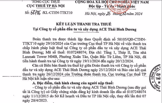 Đáng chú ý, vào tháng 1/2025, Cục Thuế TP Hà Nội đã ban hành kết luận thanh tra thuế tại Công ty cổ phần Đầu tư và Xây dựng ACE Thái Bình Dương, phát hiện hàng loạt vi phạm thuế và bị xử phạt, truy thu gần 5 tỷ đồng.