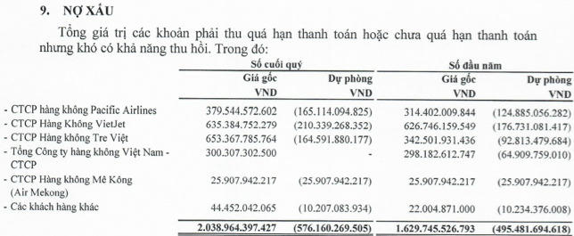 Ngoài ra Hàng không Mê Kông có 25 tỷ đồng đã được trích lập dự phòng 100% và các khách hàng khác hơn 44 tỷ đồng.