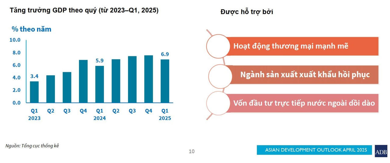 Ngân hàng Phát triển châu Á (ADB) dự báo kinh tế Việt Nam sẽ tăng trưởng 6,6% trong năm 2025 và 6,5% vào năm 2026. Tuy nhiên, ADB cũng đưa ra cảnh báo rằng những rủi ro từ bên ngoài, đặc biệt là căng thẳng thương mại toàn cầu và chính sách thuế quan mới của Mỹ, có thể đặt ra những thách thức đáng kể cho tăng trưởng của Việt Nam trong năm nay.