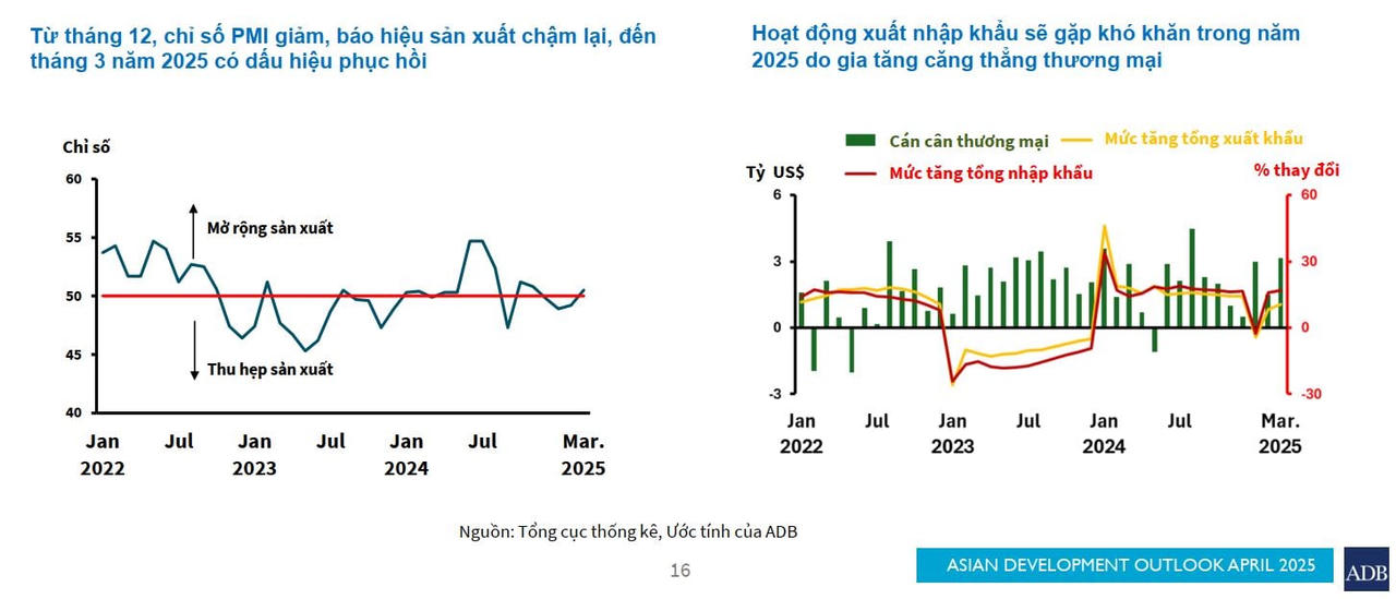Theo báo cáo của ADB, căng thẳng thương mại toàn cầu có thể ảnh hưởng đến ngành sản xuất định hướng xuất khẩu. Môi trường kinh tế toàn cầu, với xung đột thương mại và căng thẳng địa chính trị gia tăng, có thể tác động đáng kể đến ngành sản xuất định hướng xuất khẩu. Sự quay trở lại của chính sách bảo hộ dưới thời chính quyền mới của Mỹ có thể làm giảm cầu thế giới đối với các sản phẩm sản xuất tại Việt Nam, đặc biệt là khi có thặng dư thương mại lớn với Mỹ.