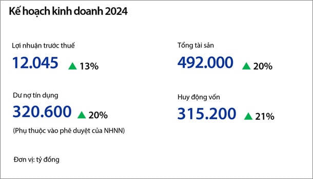 AGM đã thông qua kế hoạch kinh doanh năm 2024 do HĐQT đề xuất, bao gồm tăng trưởng tổng tài sản, dư nợ, huy động vốn và lợi nhuận. Trong đó, mức tăng trưởng dư nợ tín dụng có thể được điều chỉnh tùy thuộc vào hạn mức của NHNN.