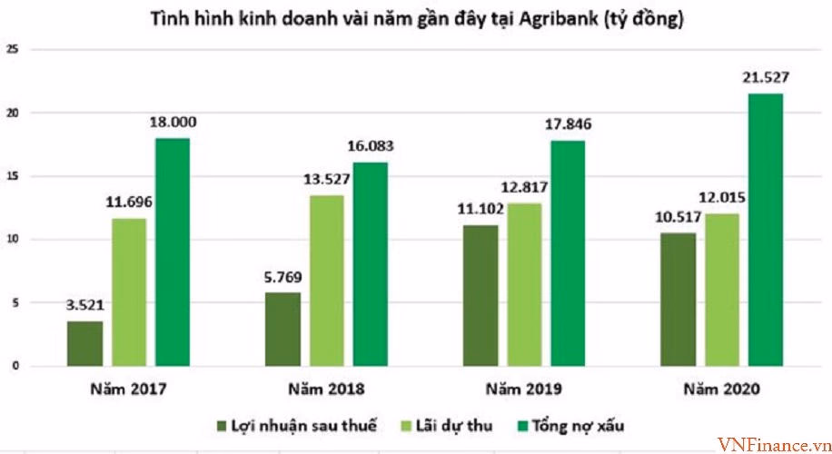 Năm 2020, Agribank ghi nhận lãi hơn 13.200 tỷ đồng, lần đầu tiên giảm sau nhiều năm tăng trưởng liên tiếp. Đáng chú ý, lãi dự thu tại Agribank cao hơn lợi nhuận, nợ phải trả lớn hơn nhiều lần vốn chủ sở hữu, trong khi nợ xấu cao chót vót.