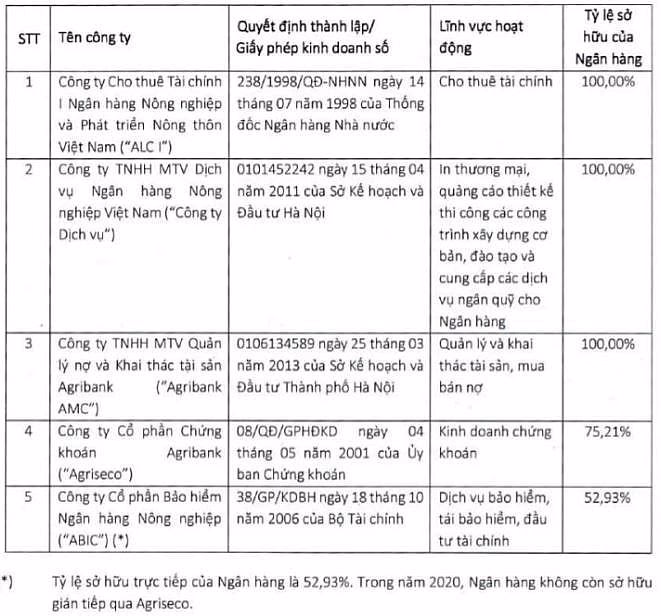 Tính đến 31/12/2020, công ty con của Agribank gồm có 5 Công ty, bao gồm: Công ty cho thuê tài chính I (ALC 1); Công ty TNHH MTV Dịch vụ Agribank; Công ty TNHH MTV Quản lý nợ và khai thác tài sản Agribank (Agribank AMC). Cả 3 công ty này đều có tỷ lệ sở hữu 100%. Bảo hiểm Agribank (ABIC) với tỷ lệ sở hữu 52,93%. CTCP Chứng khoán Agribank (Agriseco) với tỷ lệ sở hữu 75,21%. Tuy nhiên, theo thuyết minh BCTC, năm 2020 ngân hàng không còn sở hữu gián tiếp qua Agriseco.