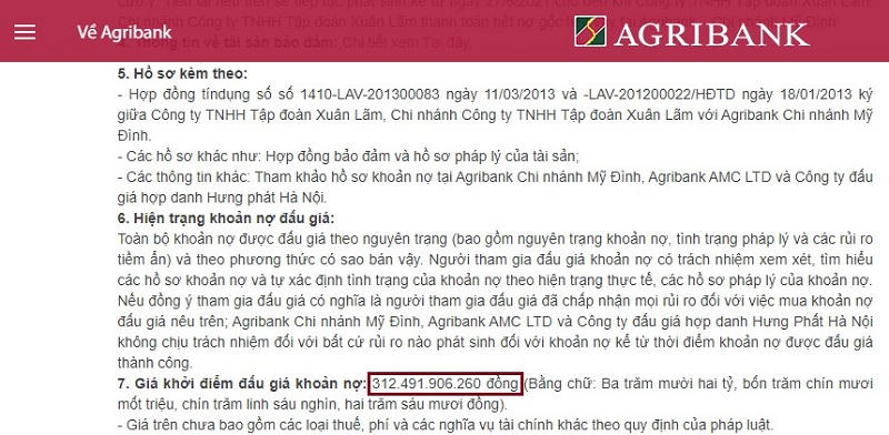 Sau nhiều lần Agribank thông báo rao bán khoản nợ hơn 312 tỷ của Tập đoàn Xuân Lãm, hiện giá khởi điểm của khoản nợ này chỉ còn 205 tỷ, giảm mạnh so với giá khởi điểm đấu giá lần 1 (312 tỷ đồng).