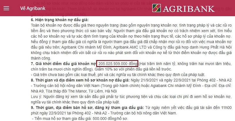 Tuy nhiên sau nhiều lần rao bán nhưng vẫn ‘ế’. Đến ngày 19/9/2021 phía Agribank chi nhánh Mỹ Đình đã có thông báo về việc ‘đại hạ giá’ khoản nợ trên. Theo đó đợt rao bán này giá khởi điểm của khoản nợ chỉ còn 205 tỷ đồng.