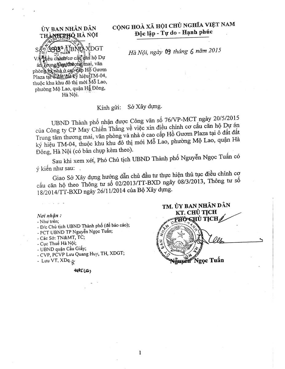 Cũng tại buổi đối thoại, ông Nguyễn Duy Ninh, Giám đốc dự án (thuộc Công ty Cổ phần Tập đoàn Hồ Gươm) lý giải: UBND TP. Hà Nội đã có văn bản số 3913/UBND-XDGT ngày 9/6/2015, đồng ý chủ trương cho công ty điều chỉnh cơ cấu căn hộ của dự án và giao cho Sở Xây dựng hướng dẫn chủ đầu tư thủ tục điều chỉnh.