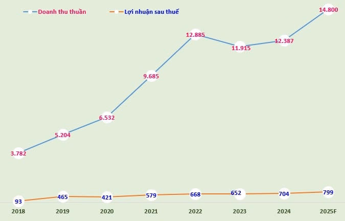 Năm 2025, công ty đặt kế hoạch 14.800 tỷ đồng doanh thu thuần và 799 tỷ đồng lợi nhuận sau thuế công ty mẹ, tăng lần lượt 19% và 13% so năm trước.