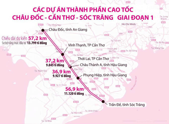 Được biết, dự án thành phần 1 thuộc Dự án đầu tư xây dựng đường bộ cao tốc Châu Đốc - Cần Thơ - Sóc Trăng giai đoạn 1 có tổng chiều dài tuyến 57km, với quy mô khoảng 390,8ha trong đó, đoạn qua địa phận tỉnh An Giang 56,5km; đoạn qua địa phận TP. Cần Thơ 0,5km, với tổng mức đầu tư là 13.526 tỷ đồng từ ngân sách Trung ương và ngân sách địa phương.