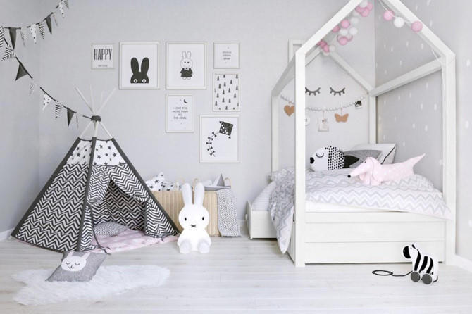 Con của bạn có thể như đang sống trong thế giới các câu chuyện cổ tích khi bước vào căn phòng có chiếc giường hình ngôi nhà và chiếc lều có vân trắng đen. Những bức tranh, con vật cũng khiến trẻ thích thú.