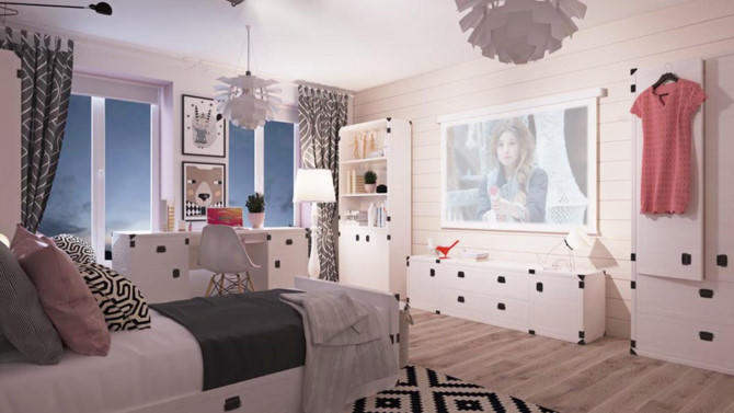 Chiếc đèn chùm màu trắng khiến cho căn phòng trở nên sáng sủa, hấp dẫn với trẻ hơn.