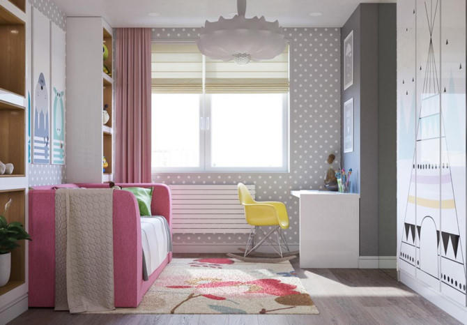Phòng của trẻ có thể kê một ghế sofa dài màu hồng, vừa giúp con bạn ngồi và nằm ngủ ở đó được.