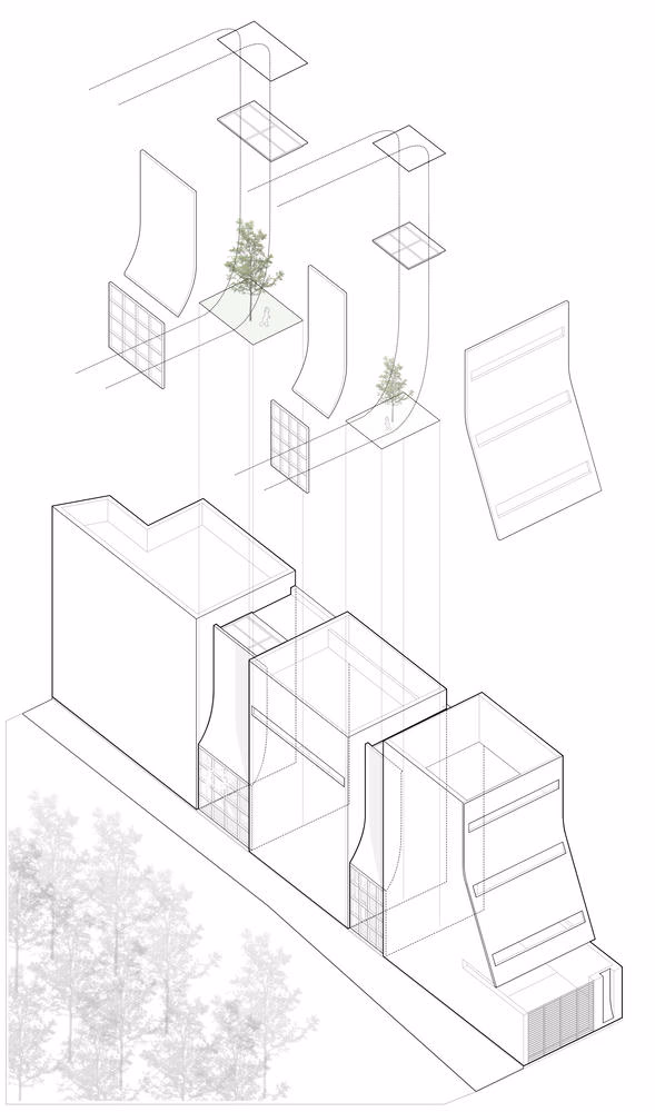 Nhìn từ bên ngoài, ngôi nhà có kết cấu 3 phần được che chắn cẩn thận để giảm bớt ảnh hưởng của cái nắng gay gắt mà ngôi nhà hướng Tây phải gánh chịu. Mặt tiền được thiết kế tối giản với mặt cong chạy dọc từ bậc cao nhất xuống cổng, tạo cảm giác như một "dòng chảy" ở ngay phía trước ngôi nhà.