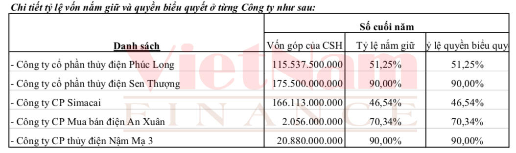 Tiếp đến là Công ty cổ phần Đầu tư thuỷ điện Nậm Ma 1A (vốn góp CSH 37,38 tỷ đồng, tỷ lệ nắm giữ 18%); Công ty cổ phần Đầu tư thuỷ điện Nậm Ma 1B (vốn góp CSH 72 tỷ đồng, tỷ lệ nắm giữ 40%); Công ty cổ phần Đầu tư thuỷ điện Nậm Ma 1C (vốn góp CSH 54 tỷ đồng, tỷ lệ nắm giữ 40%); Công ty cổ phần Đầu tư thuỷ điện Nậm Ma 2A (vốn góp CSH 60 tỷ đồng, tỷ lệ nắm giữ 40%); Công ty cổ phần Đầu tư thuỷ điện Nậm Ma 2B (vốn góp CSH 70 tỷ đồng, tỷ lệ nắm giữ 40%) và Công ty cổ phần Đầu tư thuỷ điện Nậm Ma 3 (vốn góp CSH 60 tỷ đồng, tỷ lệ nắm giữ 40%) và Công ty cổ phần thuỷ điện Phú Thọ (vốn góp CSH 60 triệu đồng, tỷ lệ nắm giữ 50%).