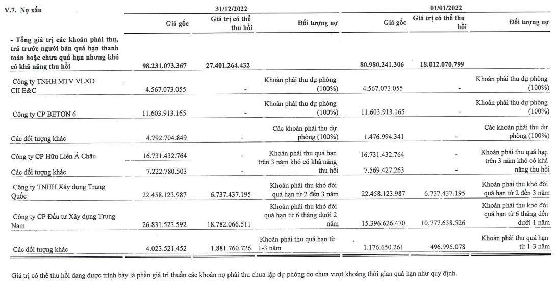 Ngoài ra, cũng tại báo cáo tài chính kiểm toán hợp nhất năm 2022, SMC cũng tồn tại các khoản nợ xấu khó đòi với các công ty xây dựng. Các khaonr nợ xấu này chưa được giải quyết từ 6 tháng đến trên 3 năm với tổng giá trị nợ xấu hơn 98 tỷ đồng.