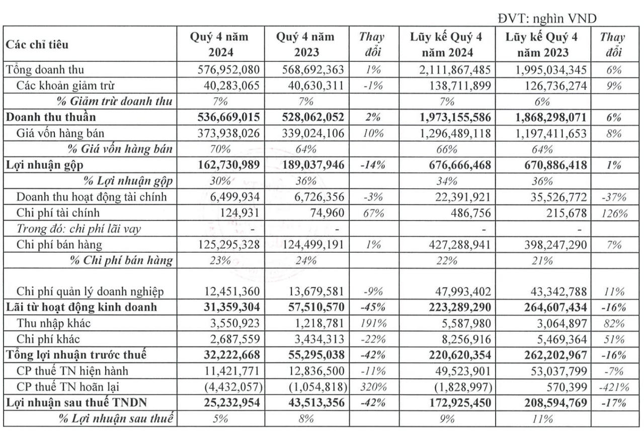 Trong khi doanh thu tăng nhẹ 2%, lợi nhuận sau thuế quý IV chỉ đạt 25 tỷ đồng, giảm mạnh 42% so với cùng kỳ năm ngoái.