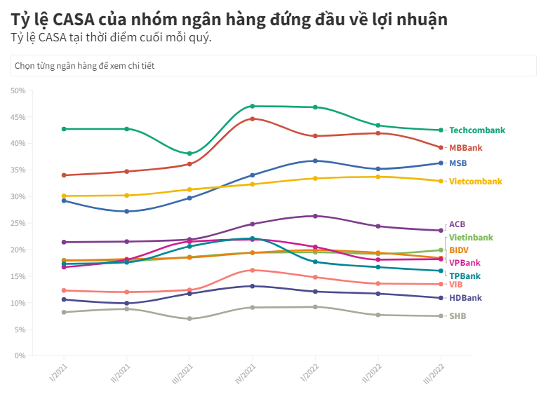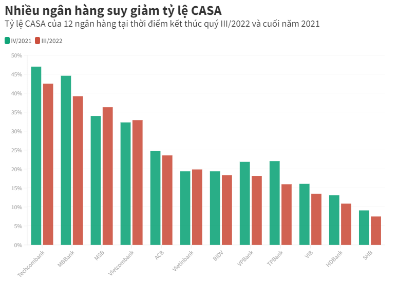 Sau 9 tháng, tỷ lệ CASA của TPBank giảm hơn 6% từ mức 22,1% vào xuống còn 16%. MB giảm 5,4%, Techcombank giảm 4,5%, VPBank giảm 3,7%. Các ngân hàng khác như ACB, VIB, HDBank, SHB, BIDV có mức giảm từ 1% đến 2% trong 9 tháng qua.