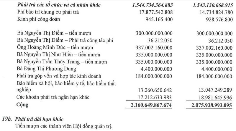 Đáng chú ý, phần lớn các cá nhân trong danh sách nhận chuyển nhượng cổ phần từ Địa ốc Hoàng Quân đều là ‘chủ nợ’ của HQC. Theo Báo cáo tài chính quý 1/2022, HQC đang nợ Chủ tịch HĐQT Trương Anh Tuấn hơn 1.100 tỷ đồng; ông Hoàng Minh Đức 337 tỷ đồng; bà Nguyễn Thị Điểm 300 tỷ đồng; bà Nguyễn Thị Như Hiền 335 tỷ đồng; bà Nguyễn Trần Thùy Trang 335 tỷ đồng. Các khoản nợ này được ghi nhận dưới hình thức tiền mượn và không có thông tin về lãi suất phải trả.