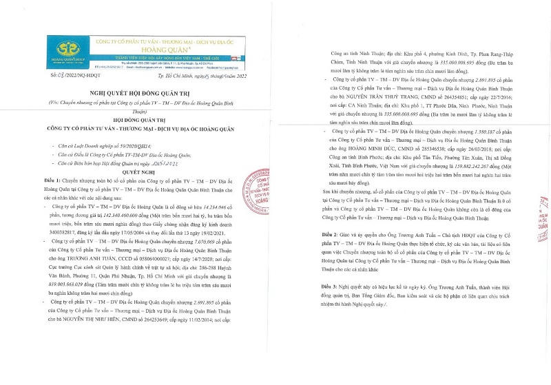 Cùng với đó, công ty cũng chuyển nhượng 14,23 triệu cổ phần tại Công ty TV – TM – DV địa ốc Hoàng Quân Bình Thuận cho nhiều cá nhân.