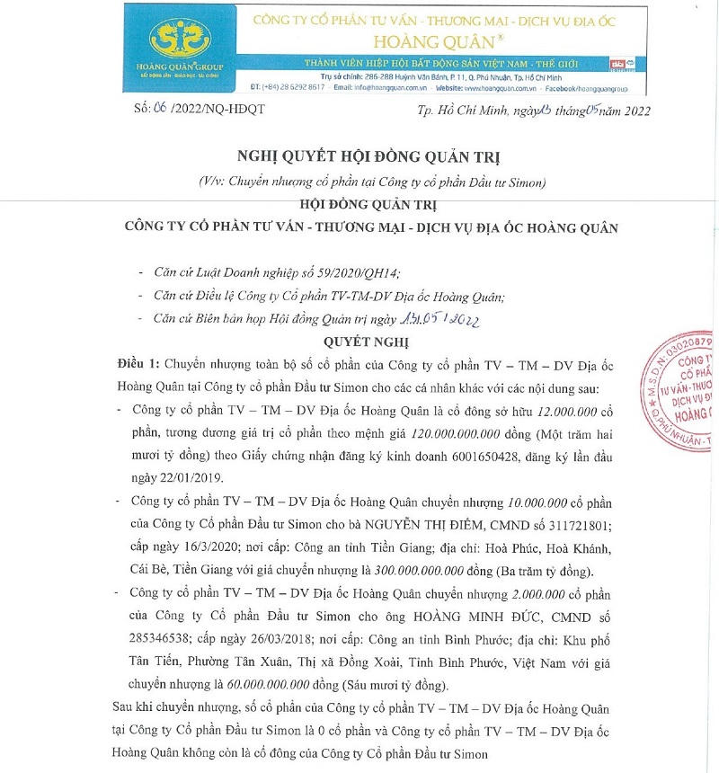 Cụ thể, Địa ốc Hoàng Quân sẽ chuyển nhượng toàn bộ 12 triệu cổ phần đang nắm giữ tại Công ty Cổ phần Đầu tư Simon cho các cá nhân khác. Trong đó, công ty chuyển nhượng 10 triệu cổ phần cho bà Nguyễn Thị Điểm với giá 300 tỷ đồng và 2 triệu cổ phần cho ông Hoàng Minh Đức với giá 60 tỷ đồng.