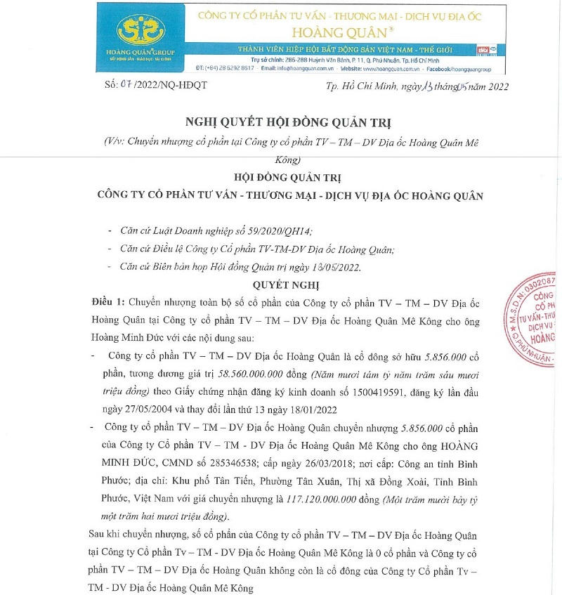 Ngoài ra, HQC cũng bán toàn bộ 5,8 triệu cổ phần tại Công ty TV – TM – DV Địa ốc Hoàng Quân Mê Kông cho ông Hoàng Minh Đức với giá 117,1 tỷ đồng. Qua đó, sau khi hoàn tất chuyển nhượng Hoàng Quân sẽ không còn là cổ đông của Hoàng Quân Mê Kông.