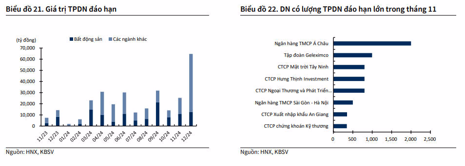 Theo VnDirect, trong tháng 11 này, dự tính sẽ có khoảng 7,4 nghìn tỷ đồng trái phiếu đáo hạn (giảm 28% so với tháng trước). Trong đó, nhóm bất động sản chiếm 38%, tổ chức tín dụng 35% và thương mại dich vụ 15%. Tính chung trong quý IV/2023, lượng TPDN đáo hạn đạt 32 nghìn tỷ, hạ nhiệt đáng kể so với quý trước.