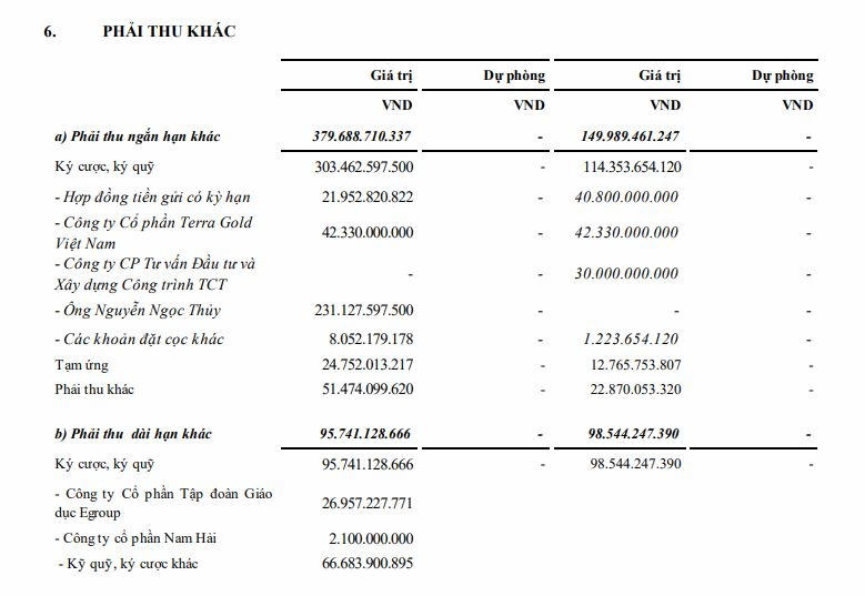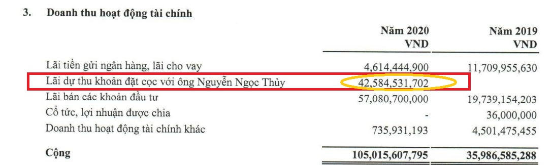 Tuy nhiên, nếu soi kỹ có thể thấy số liệu có sự chênh lệch nhỏ, đó là khoản “lãi dự thu khoản đặt cọc với ông Nguyễn Ngọc Thủy” trong mục doanh thu hoạt động tài chính là gần 42,6 tỷ đồng nhưng trong mục phải thu khác lại chỉ có 42,5 tỷ đồng.