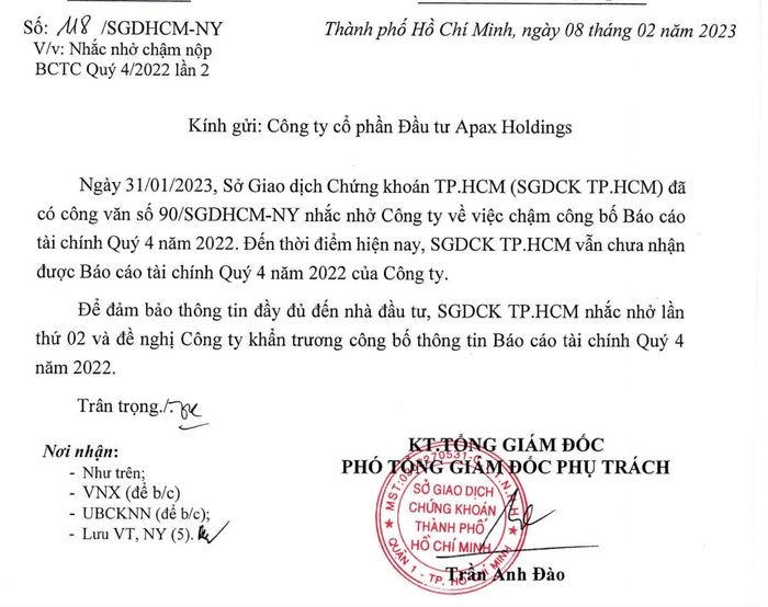 Cụ thể, ngày 31/1, HoSE đã có công văn nhắc nhở CTCP Đầu tư Apax Holdings - IBC về việc chậm nộp báo cáo tài chính quý 4/2022. Tuy nhiên đến thời điểm ngày 8/2, HoSE vẫn chưa nhận được Báo cáo của công ty.