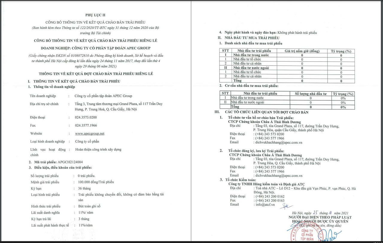 Cụ thể, theo thông tin từ Ủy ban Chứng khoán Nhà nước, Apec Group đã chào bán một lô trái phiếu với trị giá 8,1 tỷ đồng trong năm 2020 và 16 lô trái phiếu khác với tổng giá trị 499,707 tỷ đồng trong giai đoạn từ 18/1 đến 6/8/2021 ra công chúng thông qua phương tiện thông tin đại chúng và cho các nhà đầu tư không xác định.