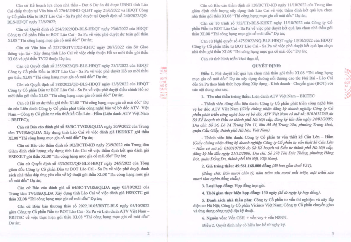 Tiếp đó, trong vai trò liên danh phụ, ATV Việt Nam cùng Công ty cổ phần tư vấn thiết kế Cầu Lớn - Hầm trúng Gói thầu XL08 Thi công hạng mục gia cố mái dốc, dự án xây dựng đường nối đường cao tốc Nội Bài - Lào Cai đến thị trấn Sa Pa theo hình thức hợp đồng Xây dựng - Kinh doanh - Chuyển giao (BOT). Giá trúng thầu hơn 49,56 tỷ đồng, giá gói thầu hơn 49,85 tỷ đồng.