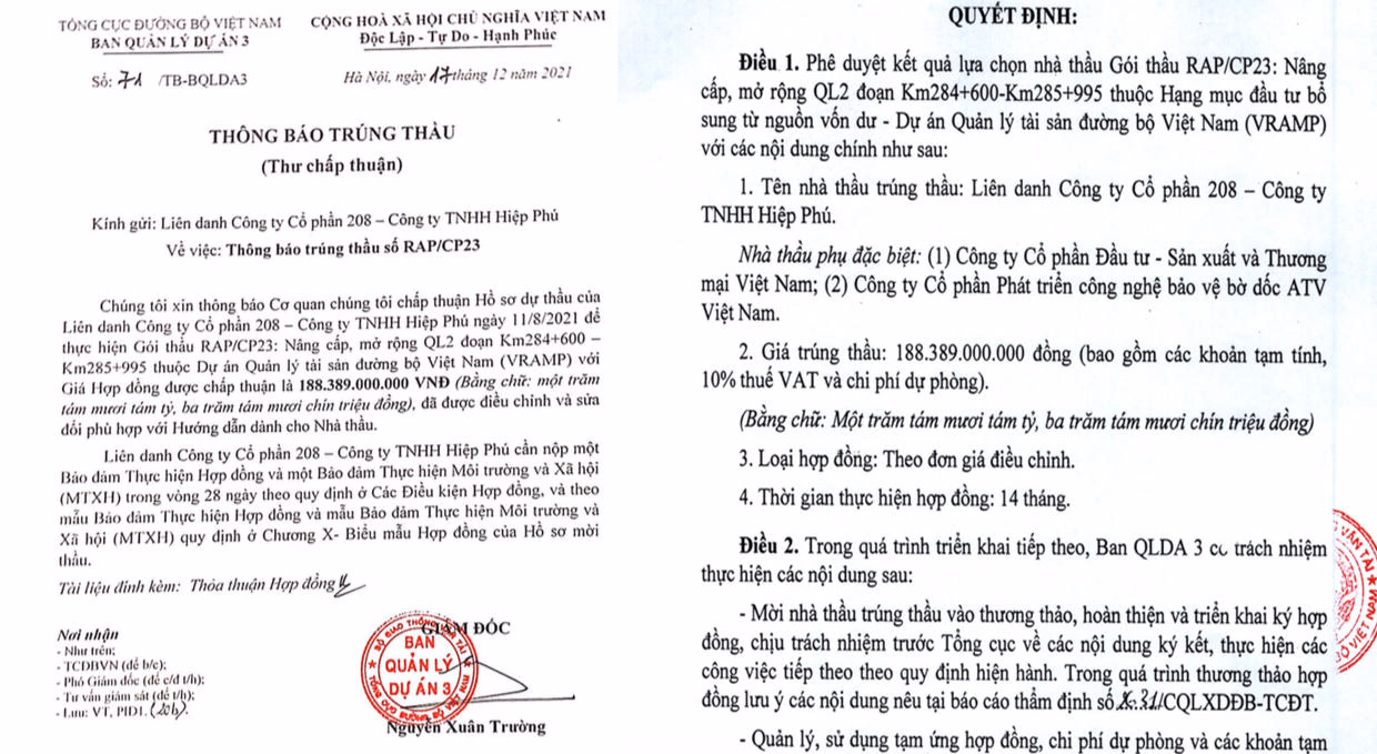 Đáng chú ý, trong vai trò nhà thầu phụ đặc biệt, ATV Việt Nam cùng các nhà thầu Công ty cổ phần 208, Công ty TNHH Hiệp Phú và Công ty cổ phần ĐTSX&TM Việt Nam trúng Gói thầu RAP CP23 Nâng cấp, mở rộng QL2 đoạn Km284+600 - Km285+995, thuộc hạng mục đầu tư bổ sung từ nguồn vốn dư Dự án quản lý tài sản đường bộ Việt Nam (VRAMP). Giá trúng thầu hơn 188,38 tỷ đồng; giá gói thầu hơn 200,9 tỷ đồng.