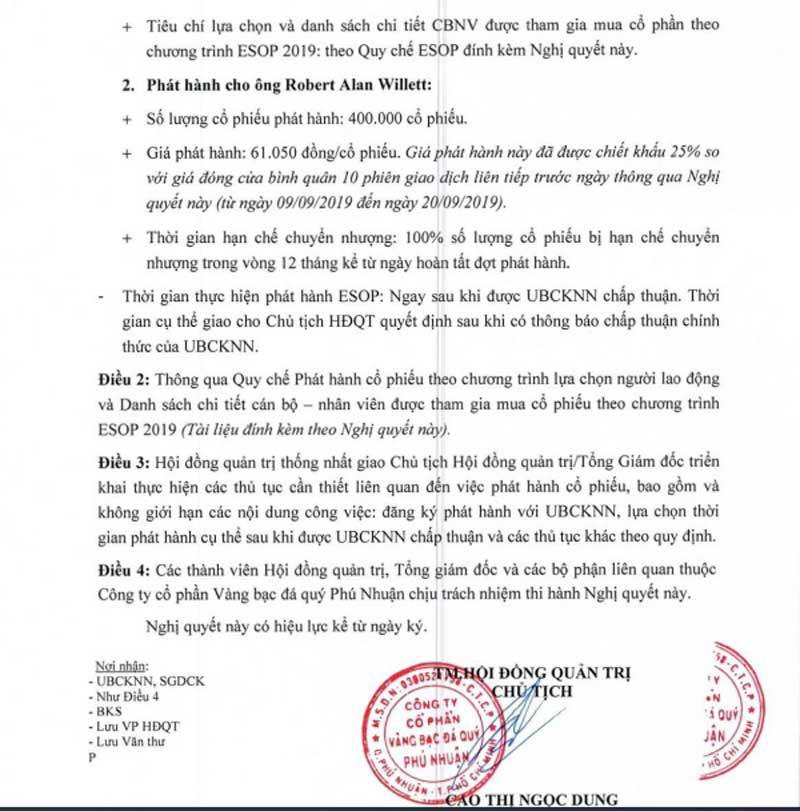 Bên cạnh đó, PNJ sẽ phát hành 400.000 cổ phiếu cho ông Robert Alan Willett với giá phát hành 61.050 đồng/cp, thấp hơn 25% so với giá đóng cửa bình quân 10 phiên giao dịch liên tiếp. Mức chênh lệch là khoảng 8 tỷ đồng.