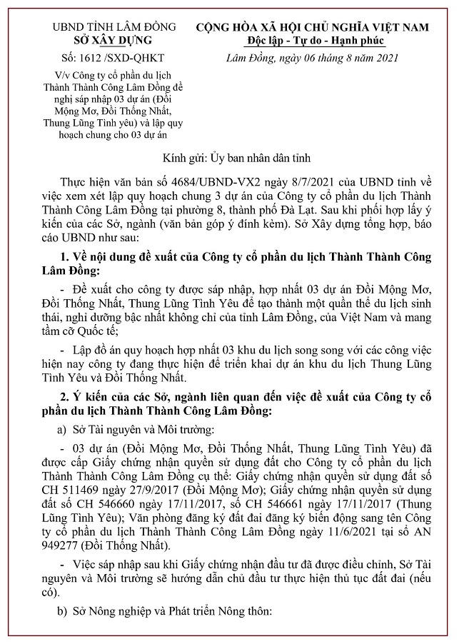 Được biết, trước đó Công ty Cổ phần du lịch Thành Thành Công Lâm Đồng đề nghị sáp nhập 3 dự án (đồi Mộng Mơ, đồi Thống Nhất, thung lũng Tình yêu) và lập quy hoạch chung cho 3 dự án.