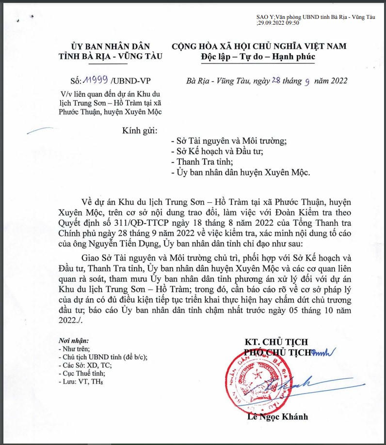 Theo đó, trên cơ sở nội dung trao đổi, làm việc với Đoàn Kiểm tra theo Quyết định số 311/QĐ-TTCP ngày 18/8/2022 của Tổng Thanh tra Chính phủ ngày 28/9/2022 về việc kiểm tra, xác minh nội dung tố cáo của ông Nguyễn Tiến Dụng, UBND tỉnh giao Sở Tài nguyên và Môi trường chủ trì, phối hợp với Sở Kế hoạch và Đầu tư, Thanh Tra tỉnh, UBND huyện Xuyên Mộc và các cơ quan liên quan rà soát, tham mưu UBND tỉnh phương án xử lý đối với dự án Khu du lịch Trung Sơn - Hồ Tràm.