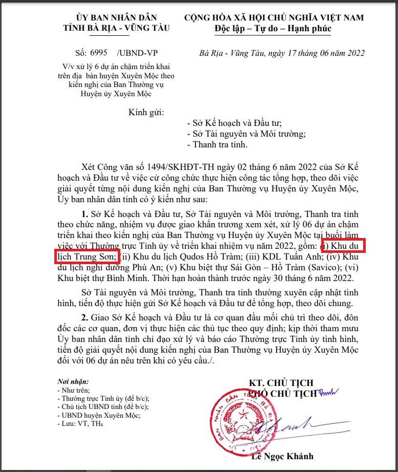 Cũng liên quan đến dự án này, trước đó ngày 17/6/2022, UBND tỉnh Bà Rịa – Vũng Tàu cũng đã ban hành văn bản số 6995/UBND-VP về việc xử lý 6 dự án chậm triển khai trên địa bàn huyện Xuyên Mộc theo kiến nghị của Ban Thường vụ Huyện ủy Xuyên Mộc.
