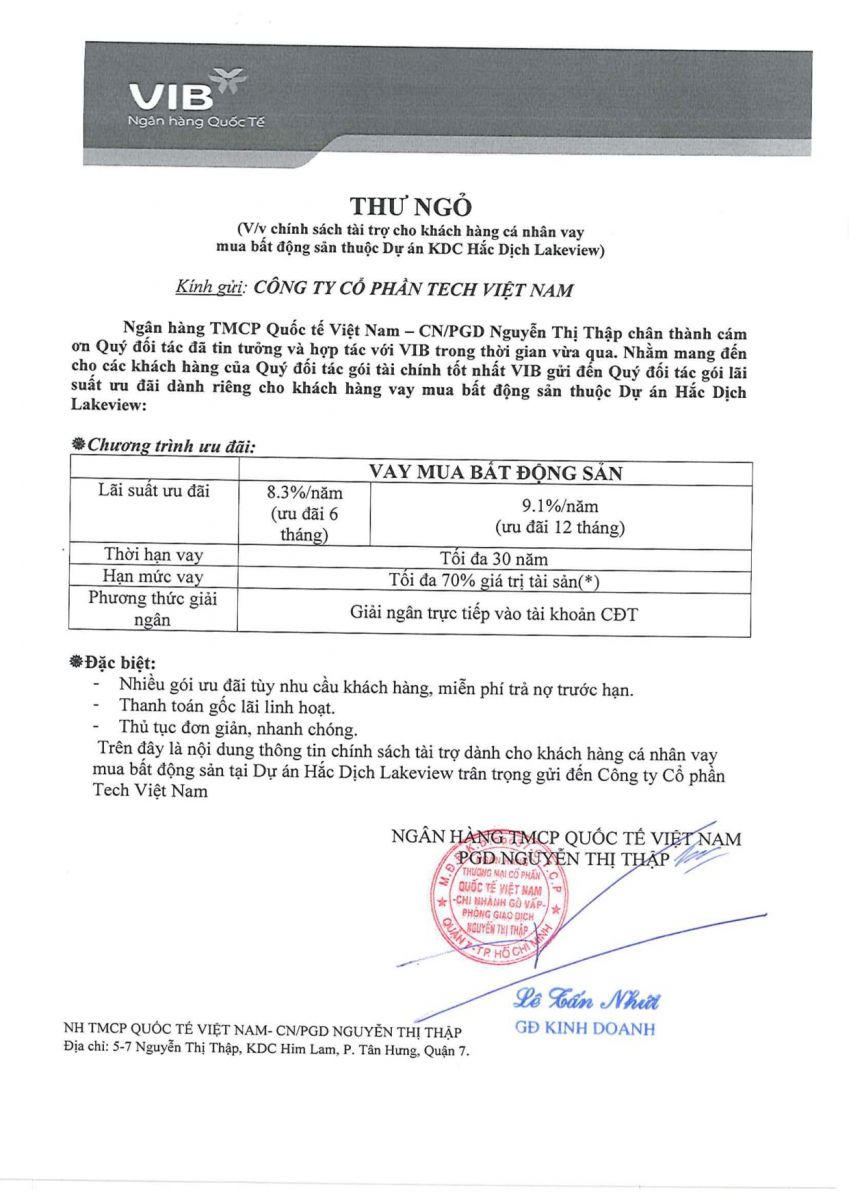 Dù thị trường không tồn tại dự án nào có tên Hắc Dịch LakeView, nhưng môi giới vẫn tung ra văn bản thông báo cho vay lên đến 70% giá trị sản phẩm của Ngân hàng Quốc tế (VIB) để câu khách.
