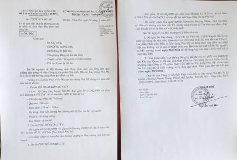 Cũng theo văn bản này, Sở TN&MT nêu tên cụ thể chủ đầu tư là Phú Mỹ Holdings với 03 dự án và hàng trăm lô nền đã được tách thửa. “Cụ thể tại Dự án Hồ Tràm Airport City (Vị trí : Xã Láng Dài , huyện Đất Đỏ) bao gồm 50 GCNQSDĐ trên diện tích khoảng 6.975,5m2, quy mô 109 nền.