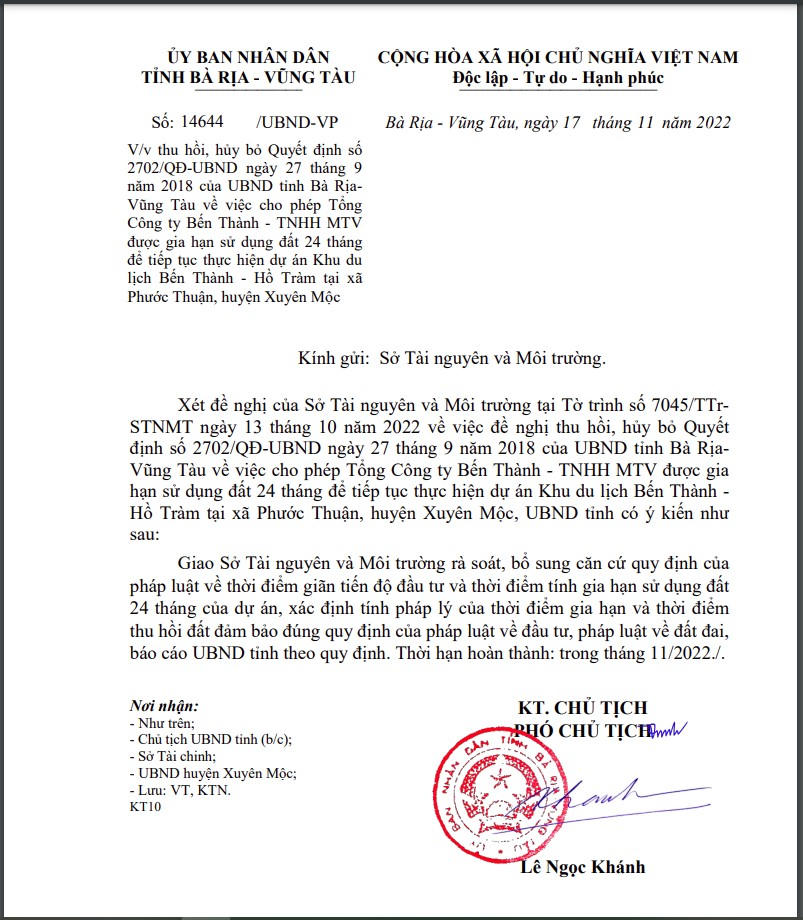Văn bản nêu rõ, xét đề nghị của Sở Tài nguyên và Môi trường tại Tờ trình số 7045/TTrSTNMT ngày 13/10/2022 về việc đề nghị thu hồi, hủy bỏ Quyết định số 2702/QĐ-UBND ngày 27/9/2018 của UBND tỉnh Bà Rịa – Vũng Tàu về việc cho phép Tổng Công ty Bến Thành – TNHH MTV được gia hạn sử dụng đất 24 tháng để tiếp tục thực hiện dự án Khu du lịch Bến Thành – Hồ Tràm tại xã Phước Thuận, huyện Xuyên Mộc.
