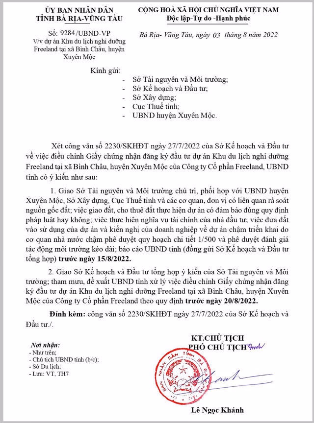 Cụ thể, ngày 3/8/2022, Phó Chủ tịch UBND tỉnh Bà Rịa – Vũng Tàu Lê Ngọc Khánh đã ký Công văn số 9284 chỉ đạo liên quan tới dự án Freeland tại huyện Xuyên Mộc của Công ty Cổ phần Freeland.
