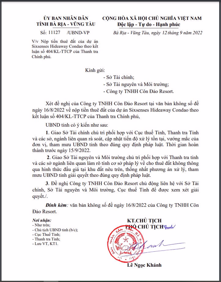 Đơn cử như, UBND tỉnh này vừa có văn bản liên quan đến việc nộp tiền thuê đất của dự án Sixsenses Hideaway Condao theo kết luận số 404/KL-TTCP của Thanh tra Chính phủ.