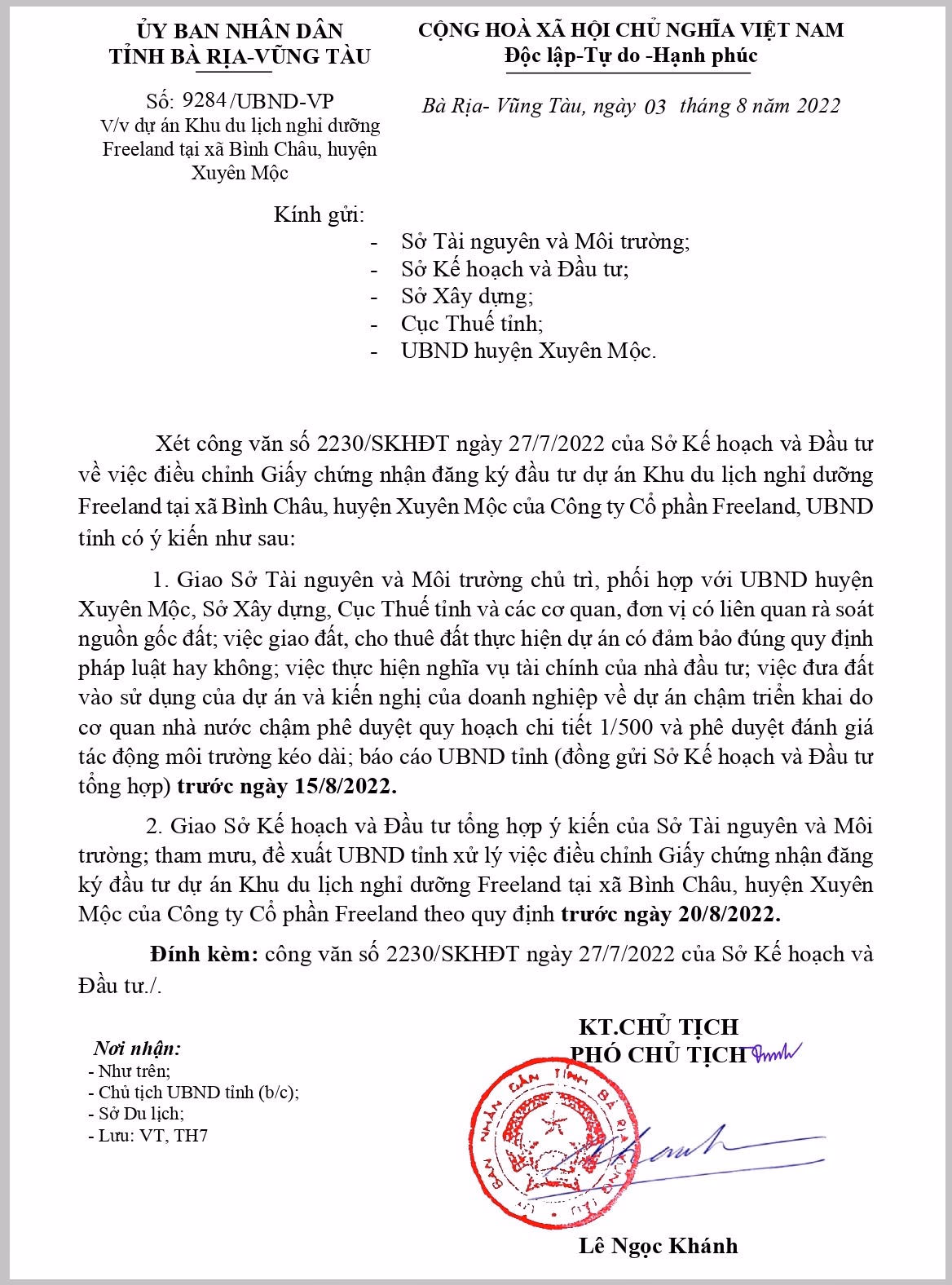 Vừa qua, Phó Chủ tịch UBND tỉnh Bà Rịa – Vũng Tàu Lê Ngọc Khánh đã ký Công văn số 9284 chỉ đạo liên quan tới dự án Freeland tại huyện Xuyên Mộc của Công ty Cổ phần Freeland.