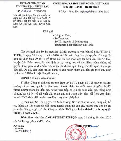 Đồng thời UBND tỉnh Bà Rịa - Vũng Tàu yêu cầu Sở TN&MT, Sở Tư pháp rà soát, cung cấp hồ sơ, thông tin liên quan các đối tượng người thâm gia đấu giá, người trực tiếp bỏ giá tại cuộc đấu giá, gửi về cho Công an tỉnh. Thời gian hoàn thành trước ngày 30/11/2020.