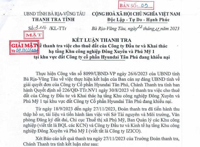 Thanh tra tỉnh Bà Rịa - Vũng Tàu mới đây đã ban hành kết luận thanh tra liên quan đến việc cho thuê đất của Công ty Đầu tư và khai thác hạ tầng khu công nghiệp Đông Xuyên và Phú Mỹ 1 (Công ty IZICO) tại khu vực đất (21ha) CTCP Hyundai Tân Phú (Công ty Hyundai Tân Phú) đang khiếu nại.